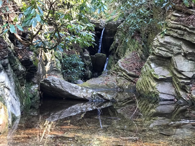 From the opposite end of the Linville Falls parking area, the trail to Duggers Creek Falls ascends up a hill for a short distance. The trail comes to a narrow wooden bridge over the creek. The falls will be a short distance upstream. If water levels are lower and there are a lot of leaves on the trees, you may have a hard time seeing the falls. You can very easily hop down and walk up the narrow creek bed as well if you don’t mind getting your feet wet.
