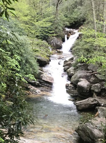 If you’re traveling along the Blue Ridge Parkway during the summer and come up to the Looking Glass Rock Overlook at Milepost 417, you may notice that the parking area is packed, but the number of people at the overlook doesn’t match the number of cars. That’s because most of them crossed the road and took the trail to Skinny Dip Falls.