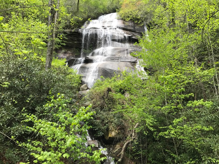 I’m not sure how Toms Spring Falls isn’t more popular than it is considering how big it is and how easy it is to get to. The problem, I guess, is that nearby Looking Glass Falls is much easier to get to and is probably more consistent in terms of flow. Toms Spring (also known as Jackson Falls and Daniel Ridge Falls) is massive and slides down several smooth ledges.