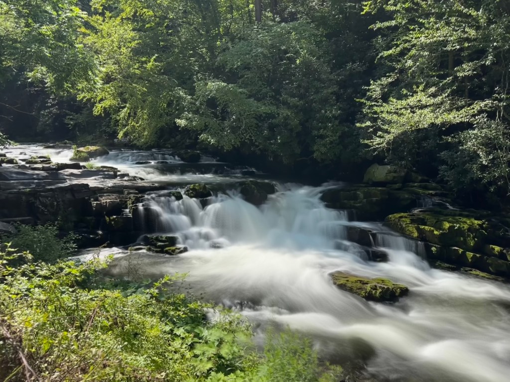 I don’t know if the Nantahala Cascade is actually an official waterfall, but it’s significant enough that if you’re traveling on Wayah Road and stopping at Jagged Rock and Whiteoak Falls, you should stop here too. This is near the end of Wayah Road and just upstream from where all the whitewater rafting starts. It’s really one of the nicest areas in the state.
