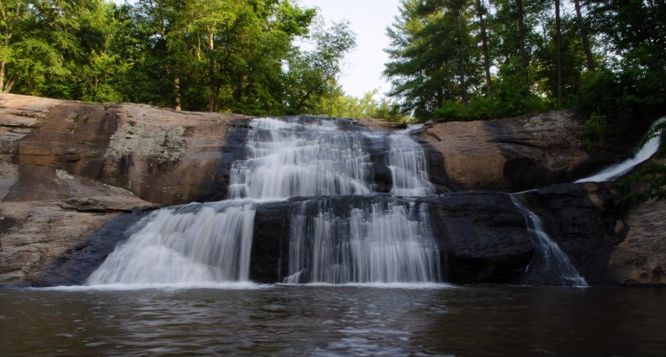 McGalliard Falls is the centerpiece of McGalliard Falls Park (go figure) just north of downtown Valdese. If you’re into religious history, the Waldenisan heritage story might be of interest in addition to the park. The falls are typical of the kind you find in this part of the state, similar to Moravian or Stone Mountain Falls in which the water slides down a half-dome shaped rock into the splash pool below.