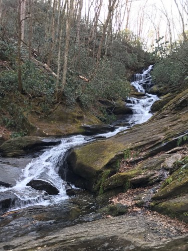 The trail follows an old forest road for almost the entire way. It’s not too steep and plenty wide. Just before the trail crosses Roaring Fork, you’ll see an old, rickety, wooden bridge with a blue blaze to the right. Take that and the falls are a short distance up the trail.