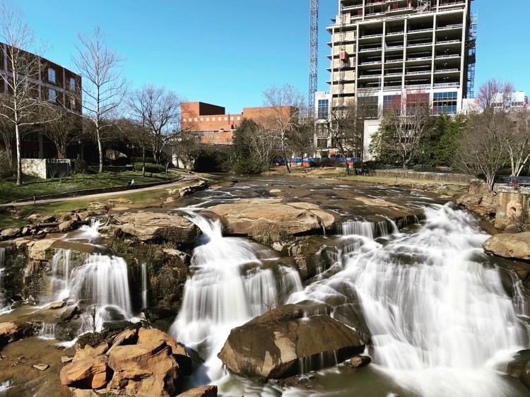 Ever wondered what a waterfall in the middle of a large city looks like? This waterfall (which doesn’t have an official name as far as I can tell) is located in the heart of downtown Greenville. The city has done a marvelous job building around the falls and creating a really cool area. On a warm day, you’ll see people doing all kinds of things in the grassy areas along the creek. Several shops and restaurants line the streets above the falls. Even more, on most days, the creek is shallow enough for you to walk out in above and below the falls, though since it’s full of city runoff, I don’t know if it’s a wise choice.