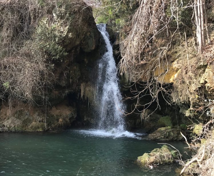 In the spring and summer when everything is in bloom, this might be one of the prettiest settings in the state. The creek shrinks into a tiny crevice at the top of the falls before spilling into an open grotto surrounded by vines, bushes, and rocks. The water that fills in the splash pool at the base is one of the most brilliant shades of blue I’ve ever seen.
